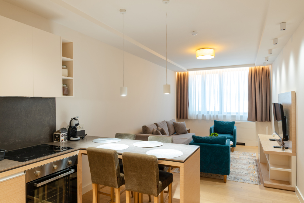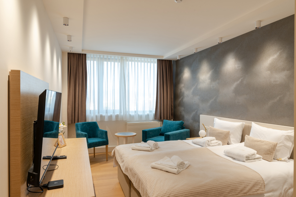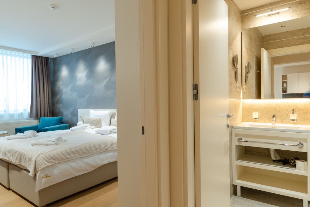Apartman površine 48m² nude premium smeštaj u samom centru Vrnjačke Banje, sa prelepim pogledom na šetalište i Promenadu. Namenjeni su za udoban boravak do 4 osobe, sa prostranim i moderno uređenim enterijerom koji spaja eleganciju, funkcionalnost i komfor. Apartmani su pažljivo opremljeni kako bi pružili potpun osećaj privatnosti i luksuza tokom boravka, dok centralna lokacija omogućava da vam svi sadržaji budu na dohvat ruke. Gosti ostvaruju i ekskluzivne pogodnosti – 50% popusta na spa & wellness sadržaje i 20% popusta u restoranu hotela, čineći ove apartmane idealnim izborom za premium odmor u Vrnjačkoj Banji.