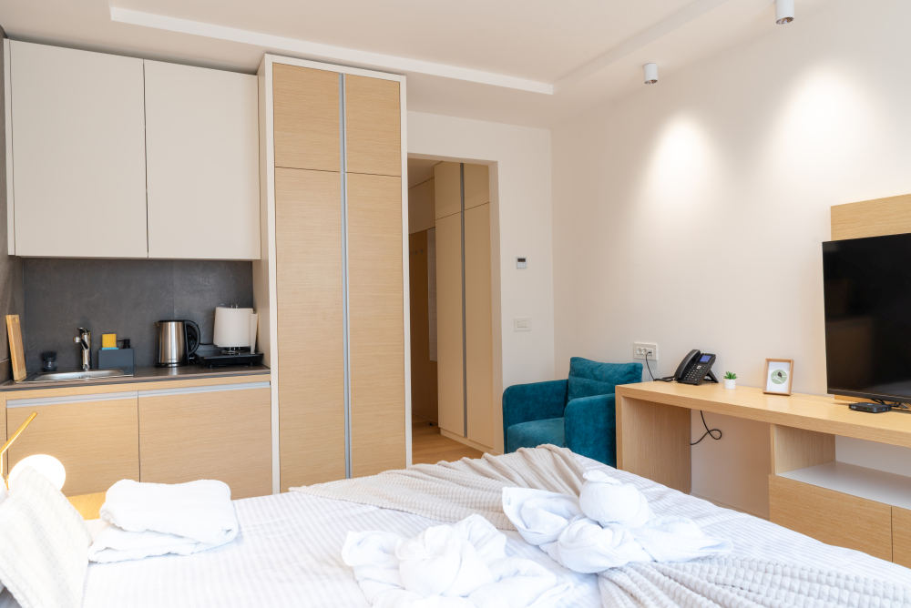22m² studio apartman u Vrnjačkoj Banji predstavlja kompaktan i funkcionalan smeštaj u samom centru Vrnjačke Banje, idealan za boravak do 2 osobe. Ovaj moderno uređen studio apartman pažljivo je organizovan kako bi pružio maksimalan komfor na manjoj kvadraturi, uz prijatnu i opuštajuću atmosferu. Apartman poseduje praktičnu čajnu kuhinju, savršenu za kraći ili duži boravak, kao i sve neophodne sadržaje za bezbrižan odmor u Banji. Zahvaljujući prestižnoj lokaciji u blizini Zepterme spa & wellness centra, gosti ostvaruju i posebne pogodnosti – 50% popusta na spa & wellness sadržaje i 20% popusta u restoranu hotela, što ovaj studio čini odličnim izborom za parove i goste koji traže kvalitetan smeštaj u centru Vrnjačke Banje.